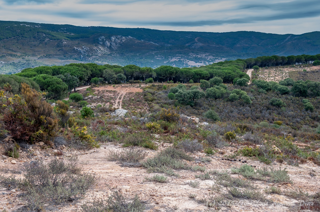 Todo este tiempo hemos caminado por una pista forestal y algo de cortafuegos y rodeados de alcornoques y quejigos pero llegamos a una zona sin arbolado dónde predomina la herriza una zona pedregosa y poco productiva dónde sólo se desarrollan especies resistentes y capaces de sobrevivir y desarrollarse con pocos nutrientes, nos acercamos a la Loma de las Cuevas.